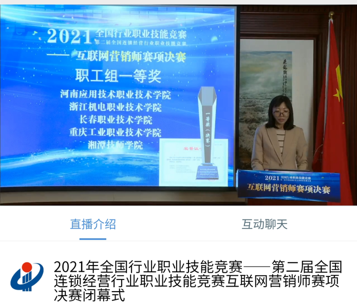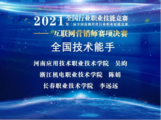 11月13日,2021年全国行业职业技能竞赛——第二届全国连锁经营行业职业技能竞赛首届互联网营销师赛项全国总决赛圆满落幕。我院皇冠APP体育教师吴昀以总分第一名的成绩获得职工组一等奖,根据竞赛规程,职工组决赛前3名的选手,在报请人力资源和社会保障部核准后,将授予“全国技术能手”荣誉称号。