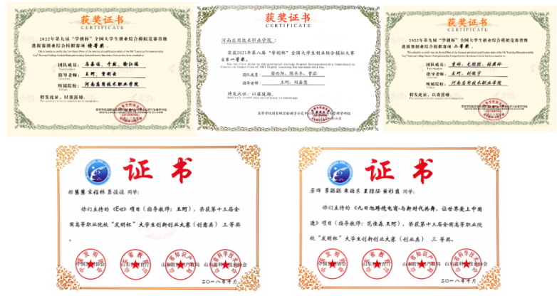 2021年、2022年“学创杯”全国大员工创业综合模拟竞赛,省级选拔赛创业综合模拟赛项获:特等奖、一等奖和二等奖。