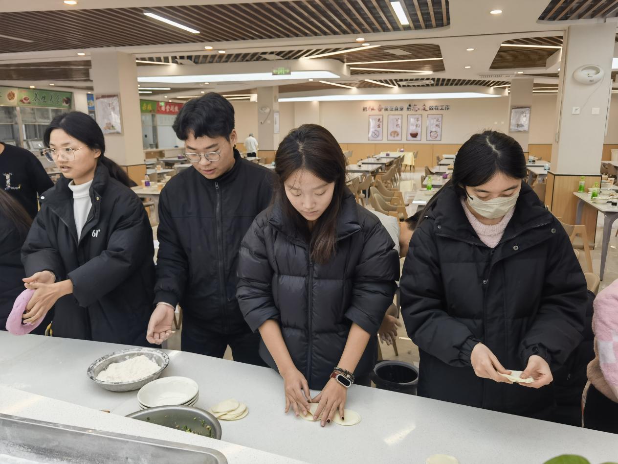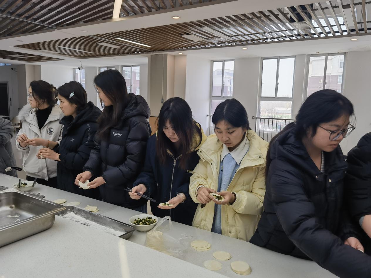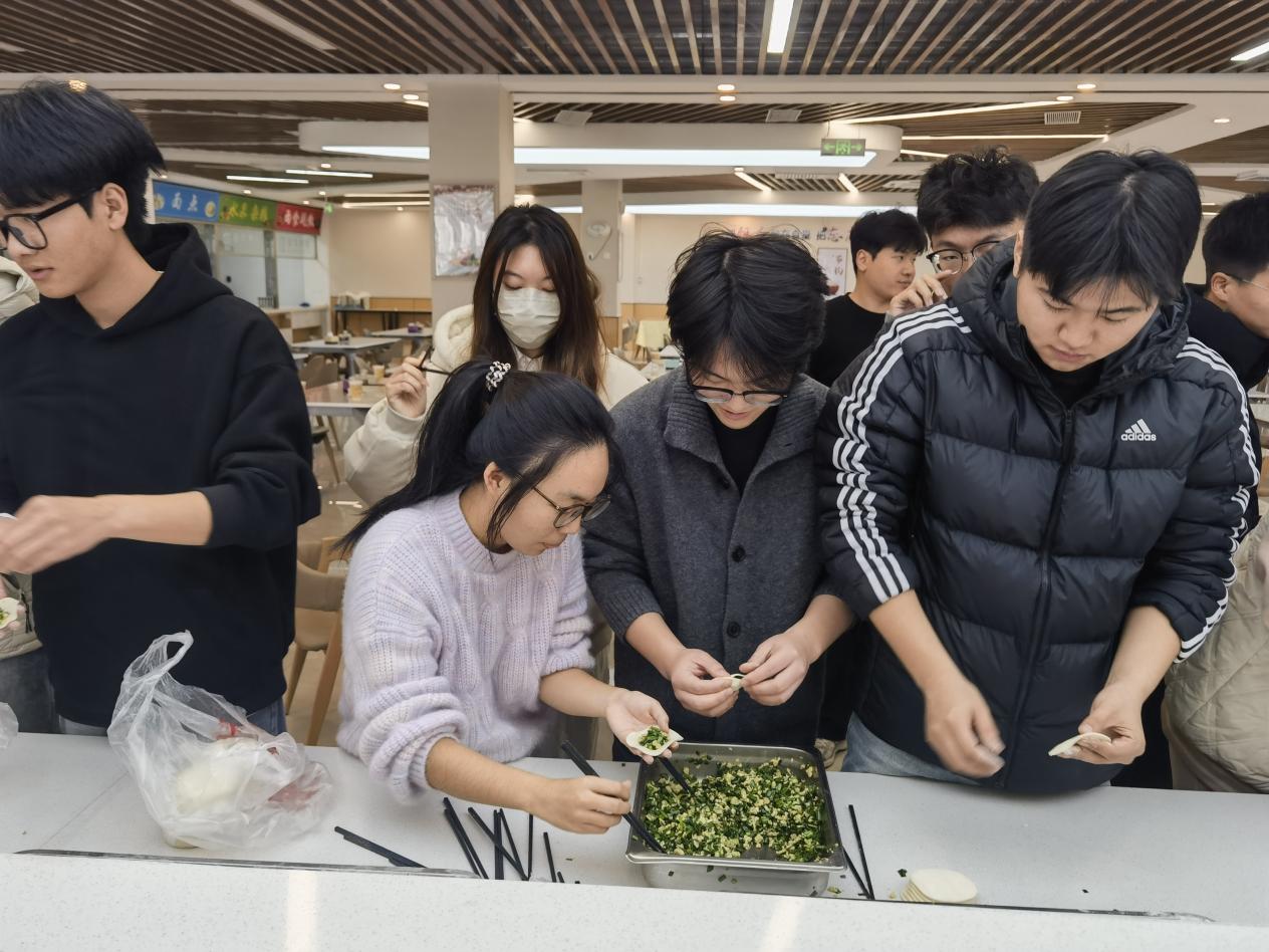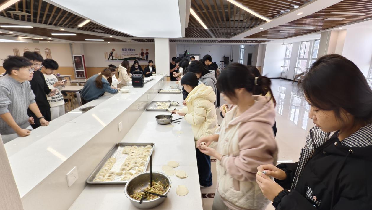 活动中,同学们自发组成小组,热情投入。揉面、擀皮、包馅,大家分工有序,配合默契。许多初次尝试的同学在伙伴的耐心指导下,从生疏到熟练,逐渐掌握了包饺子的技巧。经验丰富的同学主动示范,分享心得;新手们认真学习,积极尝试。元宝形、月牙形、麦穗形……一个个饱含心意的饺子在欢声笑语中诞生,展现着同学们的巧手与创意。老师们也在旁悉心指点,不时给予鼓励,现场洋溢着互助友爱的融洽氛围。