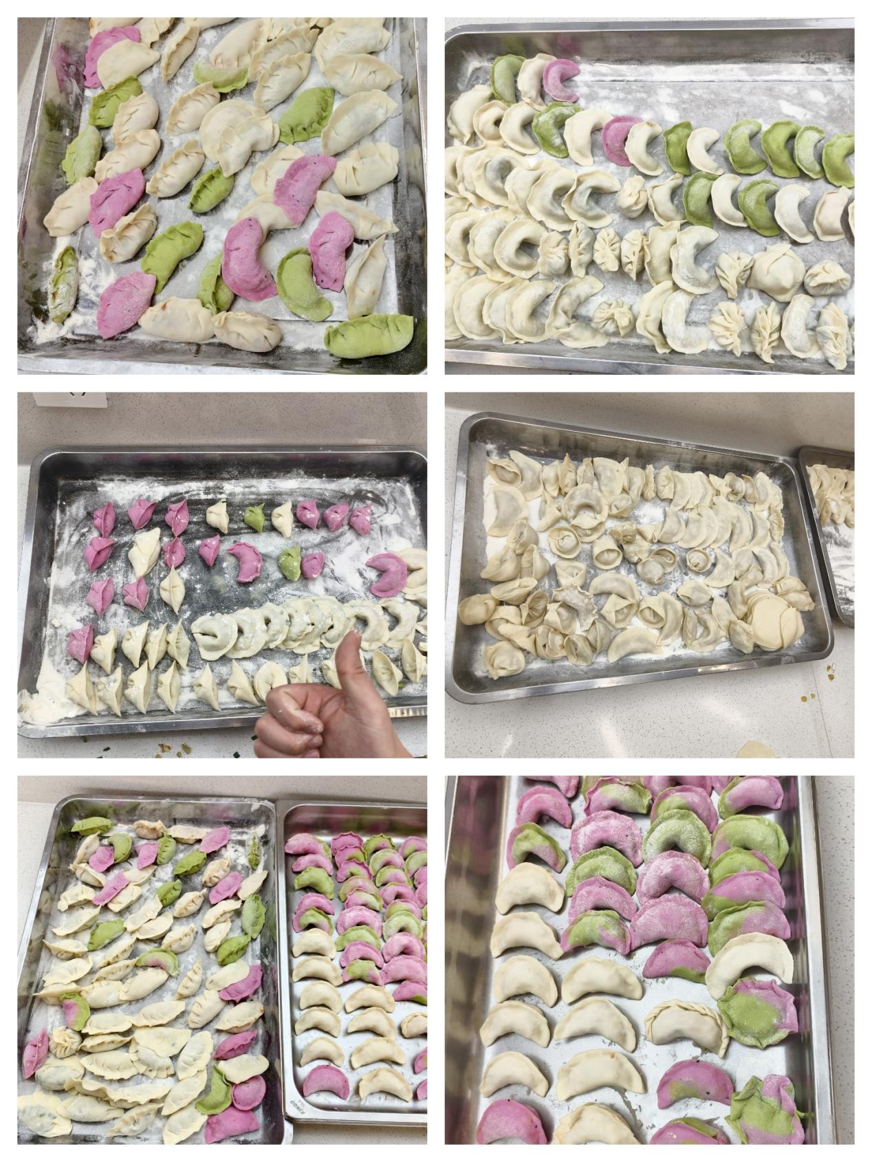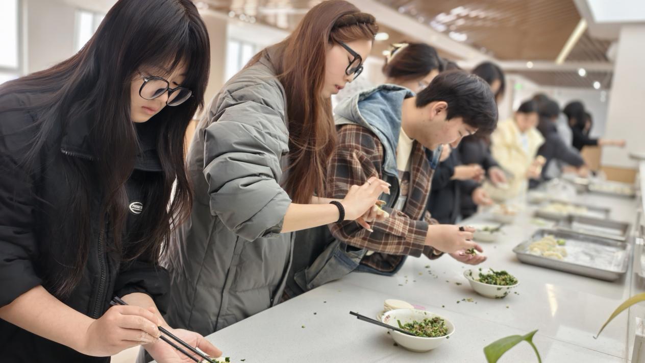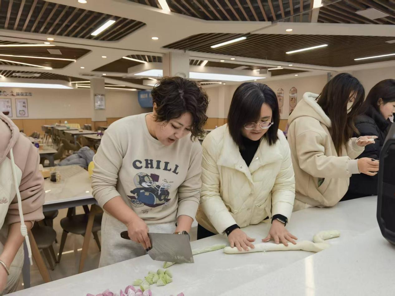 活动中,同学们自发组成小组,热情投入。揉面、擀皮、包馅,大家分工有序,配合默契。许多初次尝试的同学在伙伴的耐心指导下,从生疏到熟练,逐渐掌握了包饺子的技巧。经验丰富的同学主动示范,分享心得;新手们认真学习,积极尝试。元宝形、月牙形、麦穗形……一个个饱含心意的饺子在欢声笑语中诞生,展现着同学们的巧手与创意。老师们也在旁悉心指点,不时给予鼓励,现场洋溢着互助友爱的融洽氛围。
