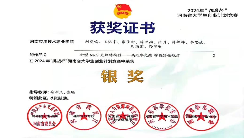 作为多个创新创业竞赛项目的核心成员,陈兰雨展现出出色的团队领导力和跨领域协作能力。在《新型MoS2光热转换器——高效率光热转换器领航者》项目中,她作为主要负责人之一,面对技术性强的专业内容,主动学习光热转换原理和技术参数,同时发挥市场营销专业特长,系统完成市场分析、商业模式设计和营销策略制定。在团队协作过程中,她善于倾听不同专业背景成员的意见,巧妙地将技术语言转化为市场语言,在技术创新与市场需求之间架起沟通的桥梁。备赛期间,她与团队成员共同钻研、反复打磨,经常为了完善方案讨论至深夜。最终,项目荣获“挑战杯”河南省大员工创业计划竞赛银奖。这个过程不仅提升了她的专业技能,更重要的是培养了她领导跨学科团队解决复杂问题的能力。