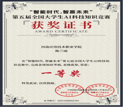 陈兰雨展现出卓越的自我规划和管理能力,不局限于市场营销专业课程,主动探索人工智能、“双碳”政策等前沿领域。从大一开始,她主动规划学习路径,利用课余时间系统补充人工智能科技知识。她通过自学相关内容,克服专业知识壁垒关键技术,最终顺利通过人工智能训练师(初级)认证。同时,她密切关注国家“双碳”战略,自主研读相关政策和行业报告,构建起跨领域的知识体系。这一系列自我驱动的学习实践,不仅拓宽了她的知识视野,更显著提升了她的信息整合与自主学习能力。正因如此,她在竞争中脱颖而出,收获奖项。