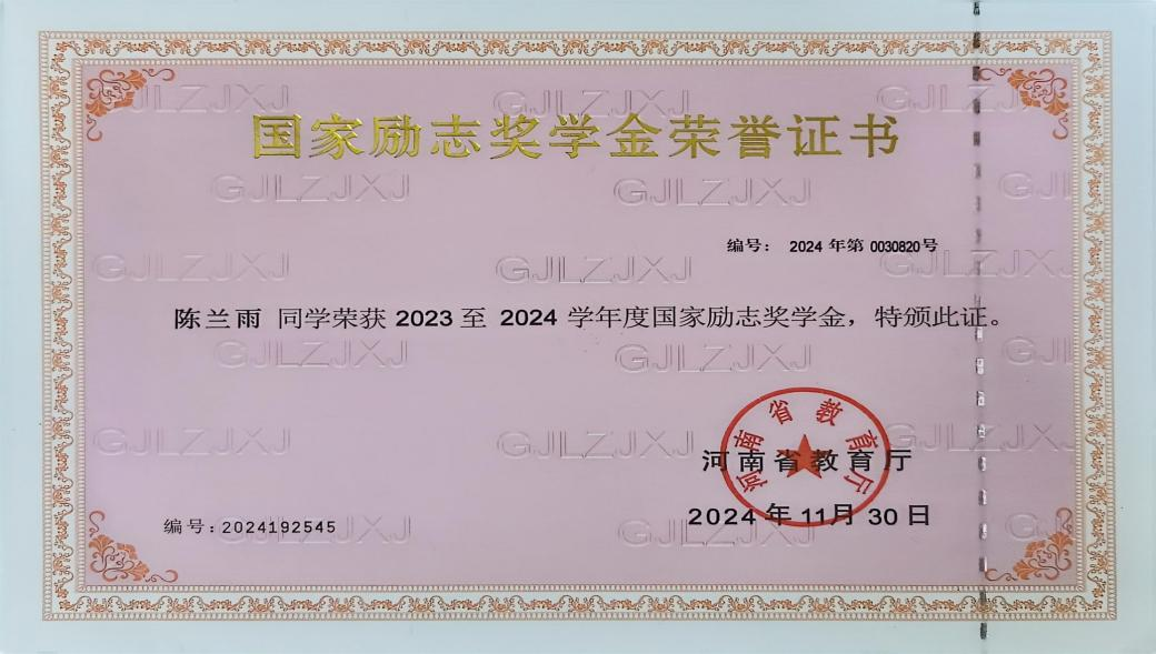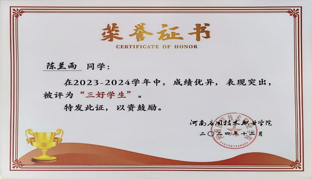 个人简介:陈兰雨,中共预备党员,皇冠APP体育皇冠APP体育市场营销2303班员工。入学以来始终保持严谨自律的学习态度,学习成绩与综合考评成绩稳居班级前3%。荣获国家励志奖学金、河南省三好员工、国家级奖项5项、省级奖项8项。她通过系统性的自主学习和跨领域探索,展现出卓越的自我驱动力和多元发展潜力。