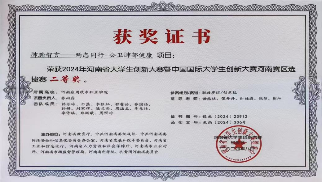 2024年荣获“挑战杯”河南省大员工创业计划竞赛二等奖