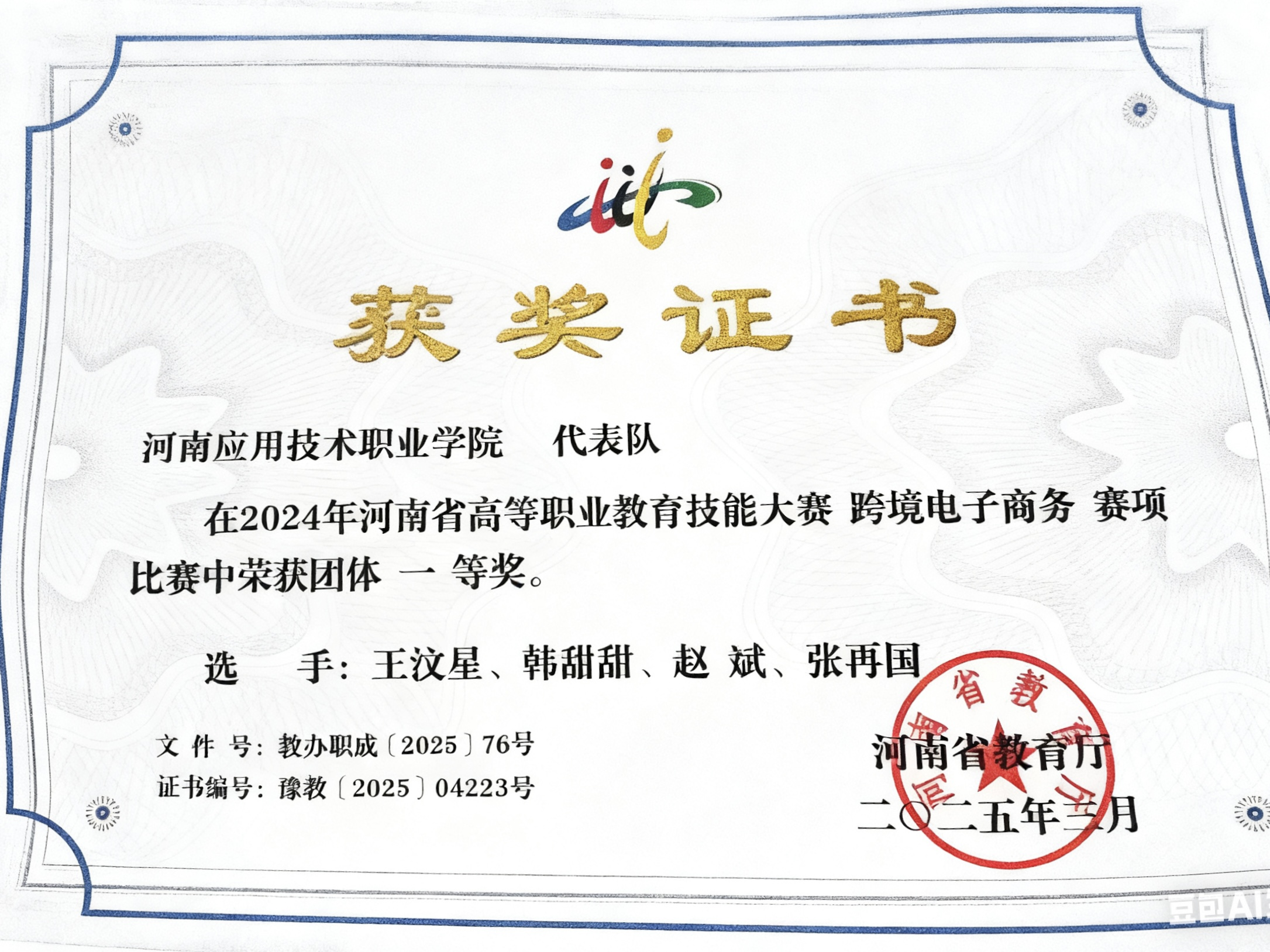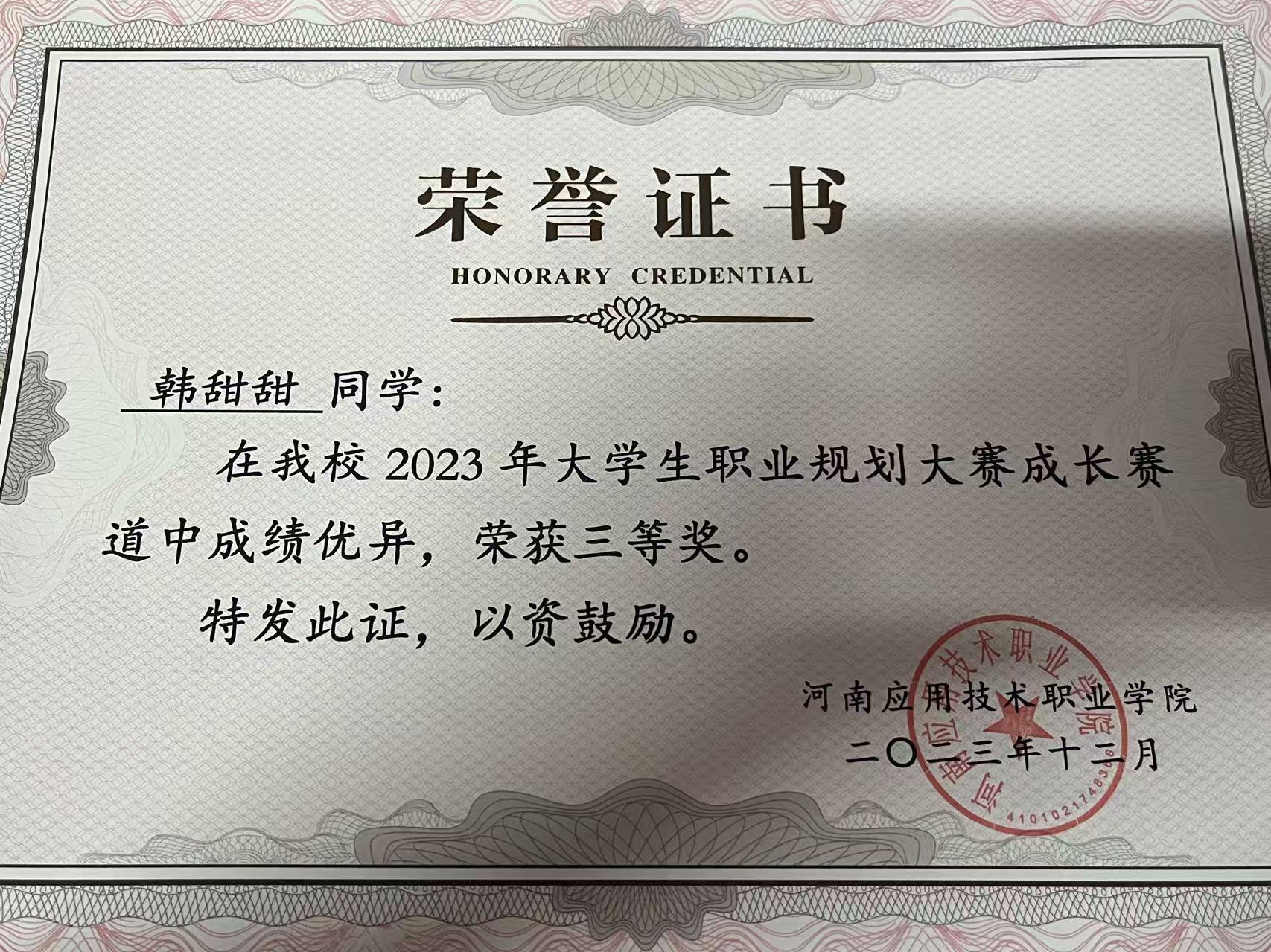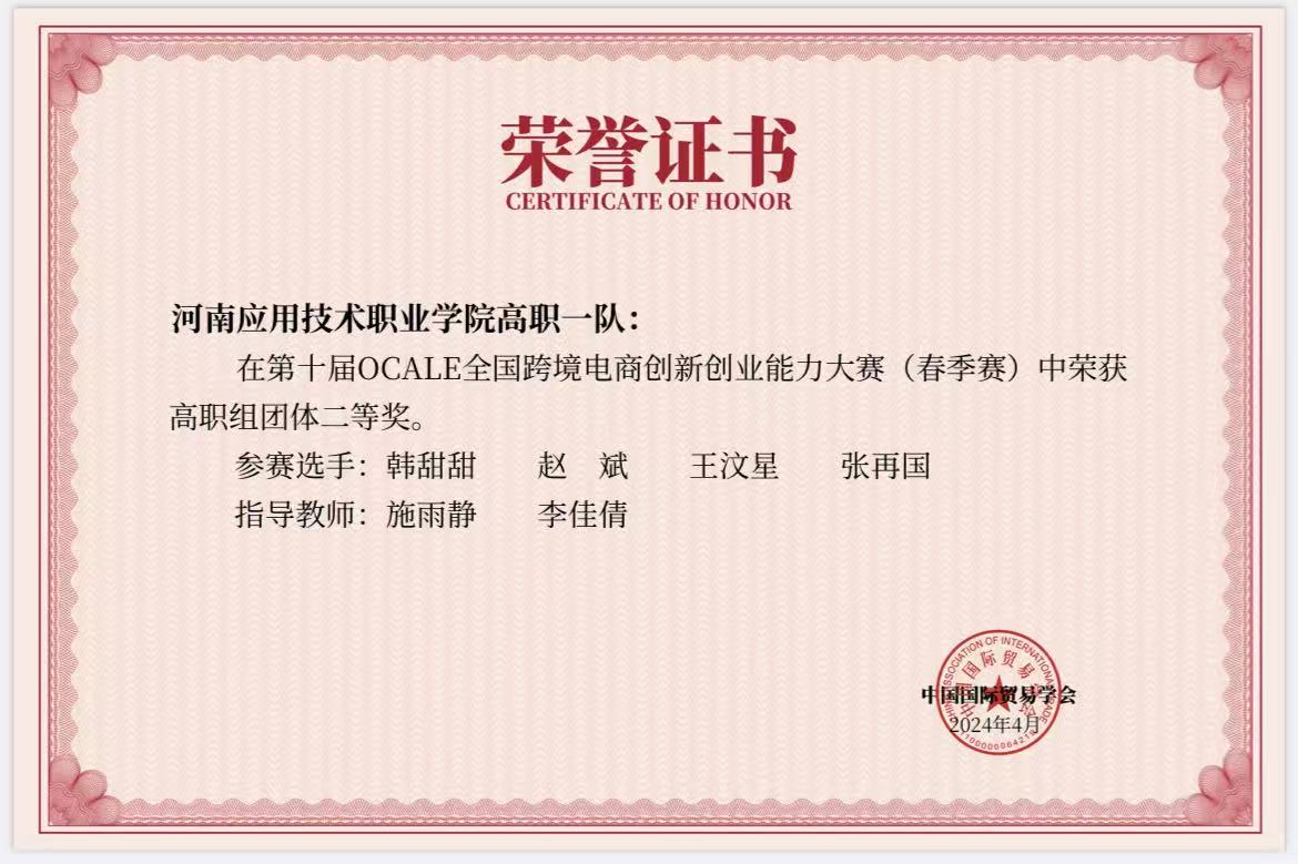 在学习中,韩甜甜坚持 “课前预习、课中深耕、课后答疑” 的严谨态度,带着疑问听课、重点难点必究,以闭环学习法夯实专业基础。她始终相信 “以赛促学” 的成长路径,主动投身各级各类技能竞赛,将课堂知识转化为实践能力。在全国跨境电商创新创业能力大赛中,她深耕方案设计与模拟运营,斩获团体与个人二等奖;在河南省跨境电子商务赛项中,凭借精准解题思路与优化操作流程,勇夺一等奖;还先后拿下河南省大员工创新大赛三等奖及多项校级竞赛荣誉,形成 “学习 - 实践 - 改进” 的良性循环。如今,她的班级与专业成绩、量化排名均稳定第一,用实力印证了勤学善思的优良学风。