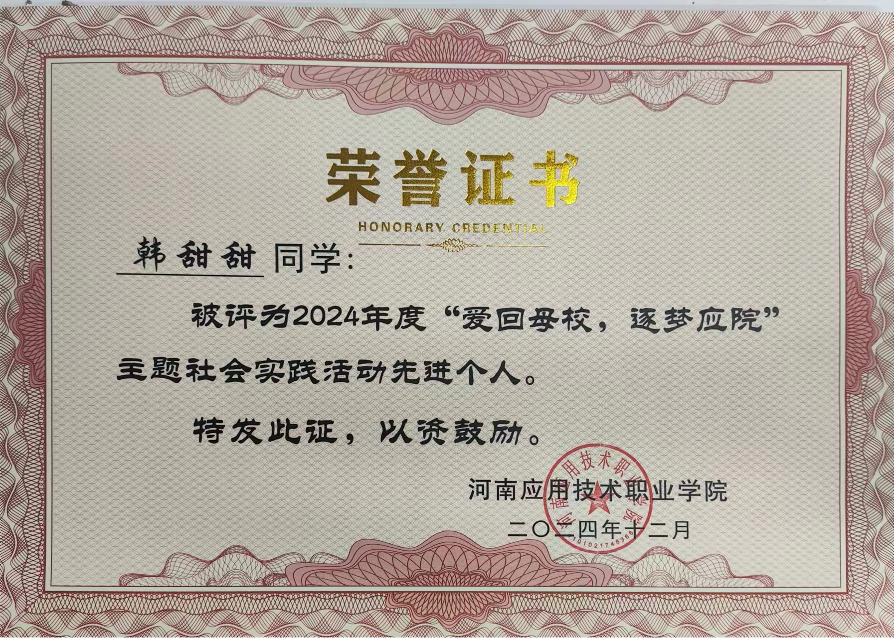 韩甜甜始终将所学与社会需求紧密结合,积极投身各类社会实践。暑期 “三下乡” 活动中,她深入开封西姜寨乡田间地头,走访葡萄园与红薯种植基地,协助农户搭建线上销售渠道、传授直播带货技巧,用电商专业知识助力农产品走出乡村;在“爱回母校,逐梦应院” 活动中,她重返高中母校分享经验、解答困惑,获评 “先进个人”;寒假期间,她参与 “向基层报道” 返家乡实践,为家乡建设建言献策,同时在登封共青团担任志愿者,细致整理非遗材料,用点滴行动传递青年担当。