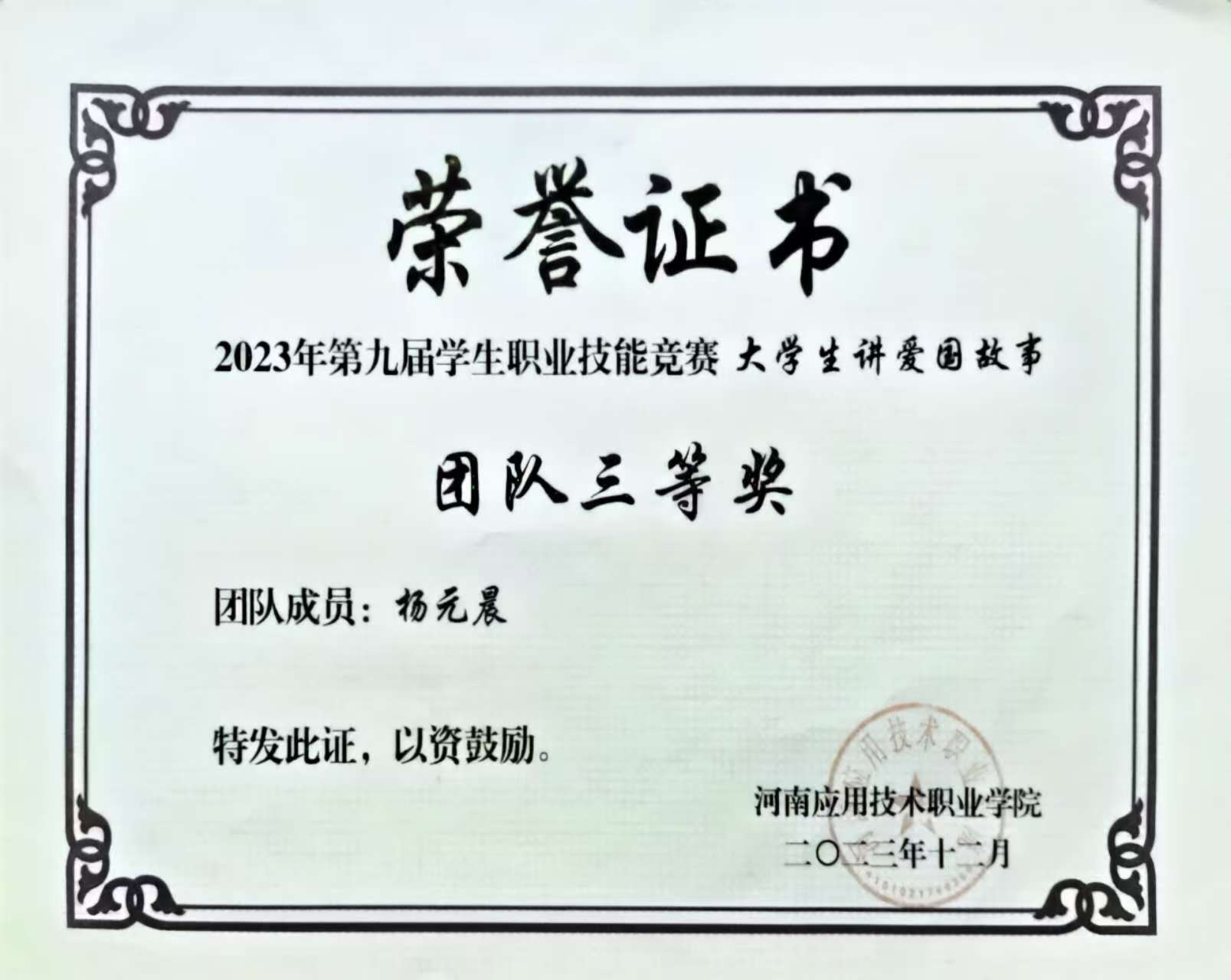 杨元晨同学作为共青团员,思想上积极进步,热爱祖国,始终认真学习党的理论知识,自觉践行社会主义核心价值观。2022-2024年获得“优秀共青团员”荣誉,她深知“小我融入大我”的道理,主动投身于各项志愿服务中,高中起,志愿服务贯穿了她的学习生涯:从2021年“致敬戍边英雄王焯冉”活动、“防溺水安全系列教育”、“禁烟,我们在行动”,到2022年“不忘初心学雷锋”、“抗击疫情,志愿同行”,再到2023年的“植绿护绿,创建绿色家园”、“向雷锋学习,树校园新风”,特别是漯河市青志协会举办的“儿童安全生存训练”,她先后6次前往留守儿童学校,为留守儿童带去安全知识讲座与趣味活动,烈日炎炎,哪怕被晒伤也没有停止前行的脚步,依旧坚守在自己的知识岗位上。进入大学后,她的志愿脚步未曾停歇:2024-2025年“应尽全力,志愿同行”博览会开幕式、“献血服务志愿者”、“河南省第三届职业技能大赛”等活动中,都能看到她专注志愿服务的身影。