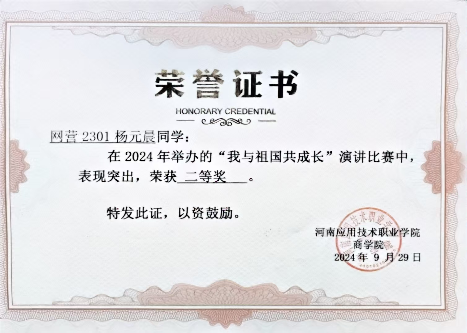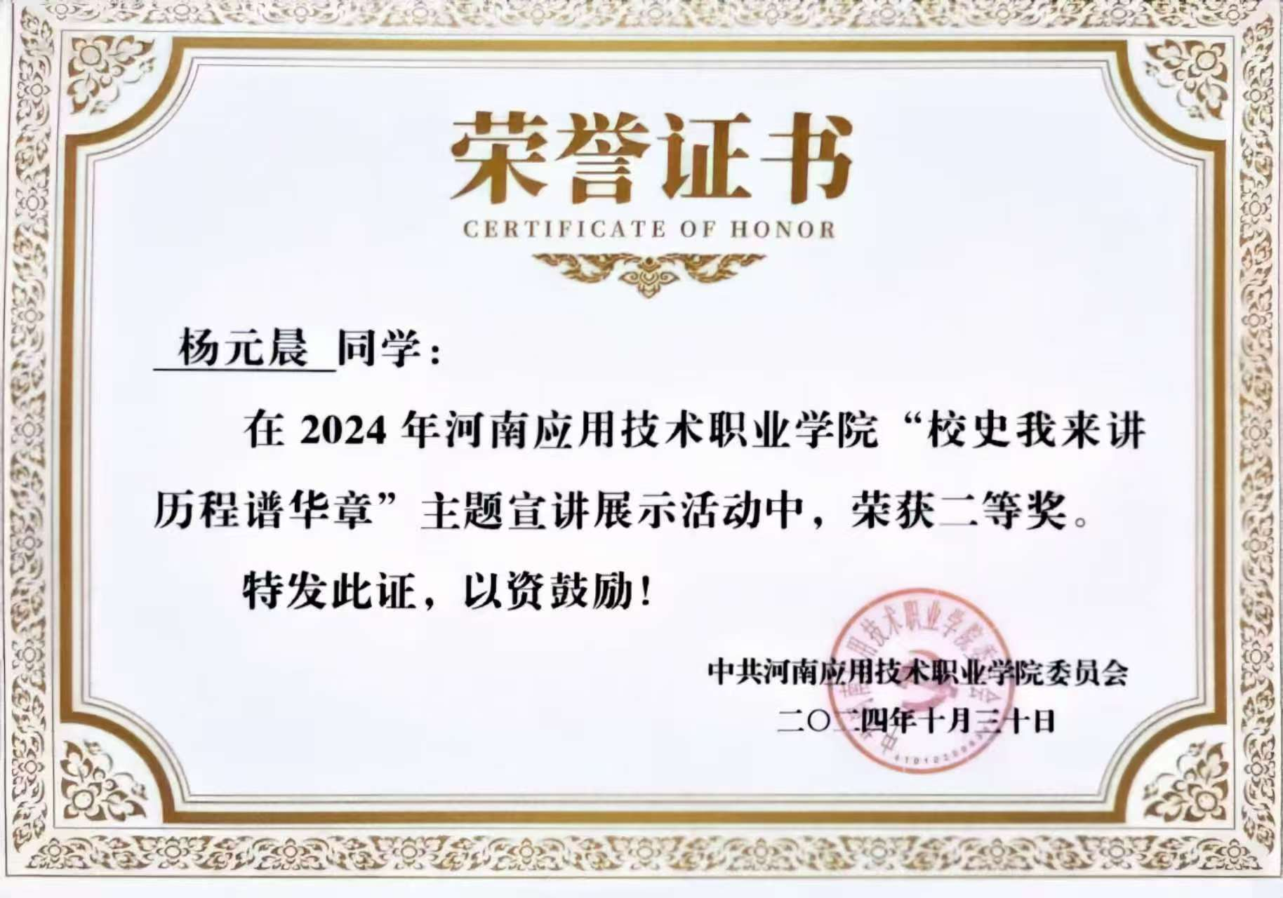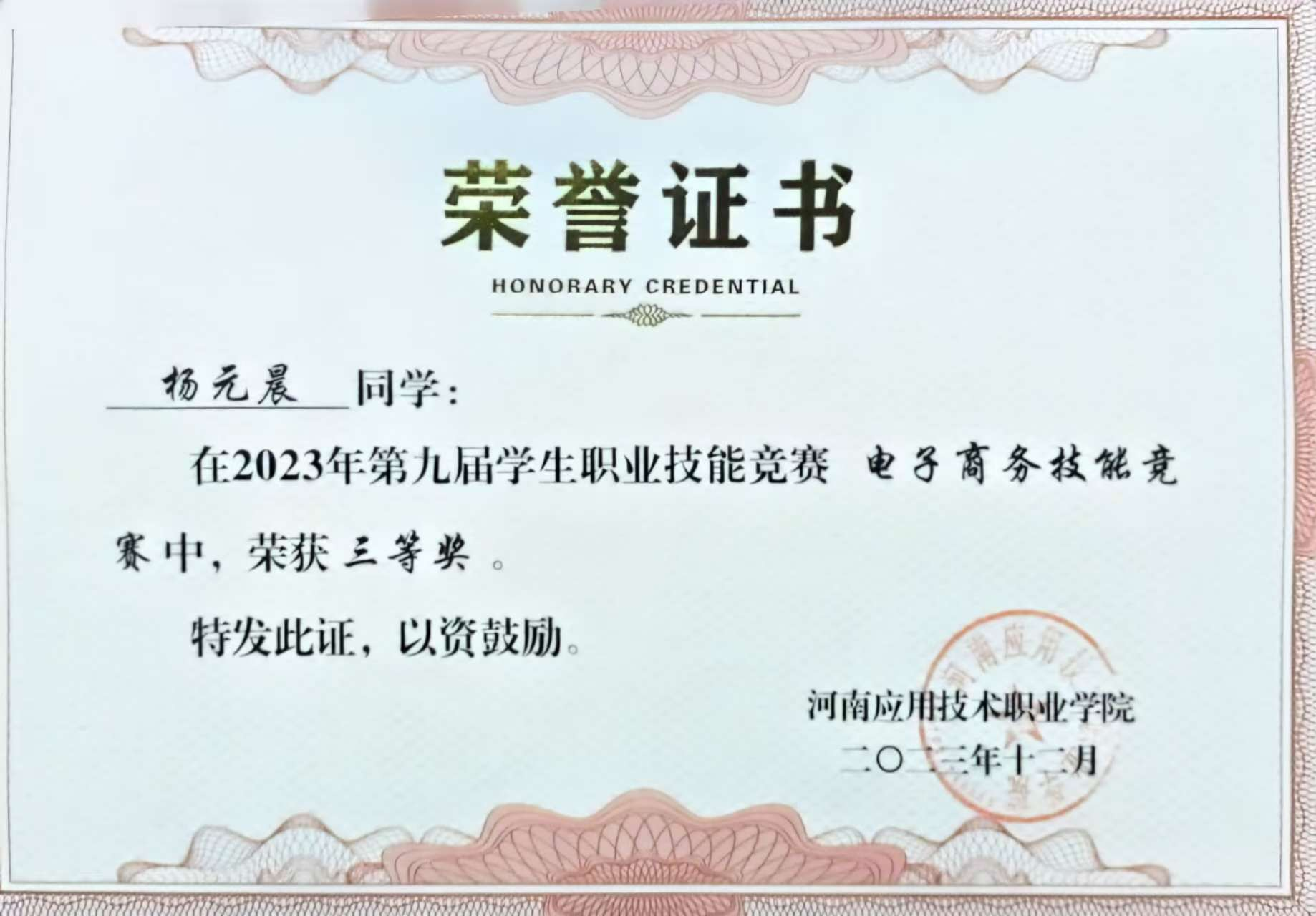 作为一名员工,杨元晨深知学业是本分。她的努力结出了丰硕的果实:学年量化评分高居班级榜首,综合成绩位列班级第二。她的学习成果远不止于课堂成绩,2024年取得国家励志奖学金,也通过自己的努力考取了“中级电子商务师”“1+X呼叫中心客户服务”“二级甲等普通话”等职业技能证书;同时在技能竞赛方面,也取得了一些相应的成绩,“挑战杯大员工创业竞赛”省级银奖4项,“中国国际大员工创新大赛”省级银奖1项,“职业生涯规划大赛”省级铜奖“电子商务技能竞赛”校级三等奖等;在文化素养和表达能力方面,杨元晨同学同样出色,经过不懈努力,她成功斩获“文明风采经典诵读比赛”省级银奖、“校史我来讲,历程谱华章”校级二等奖等。