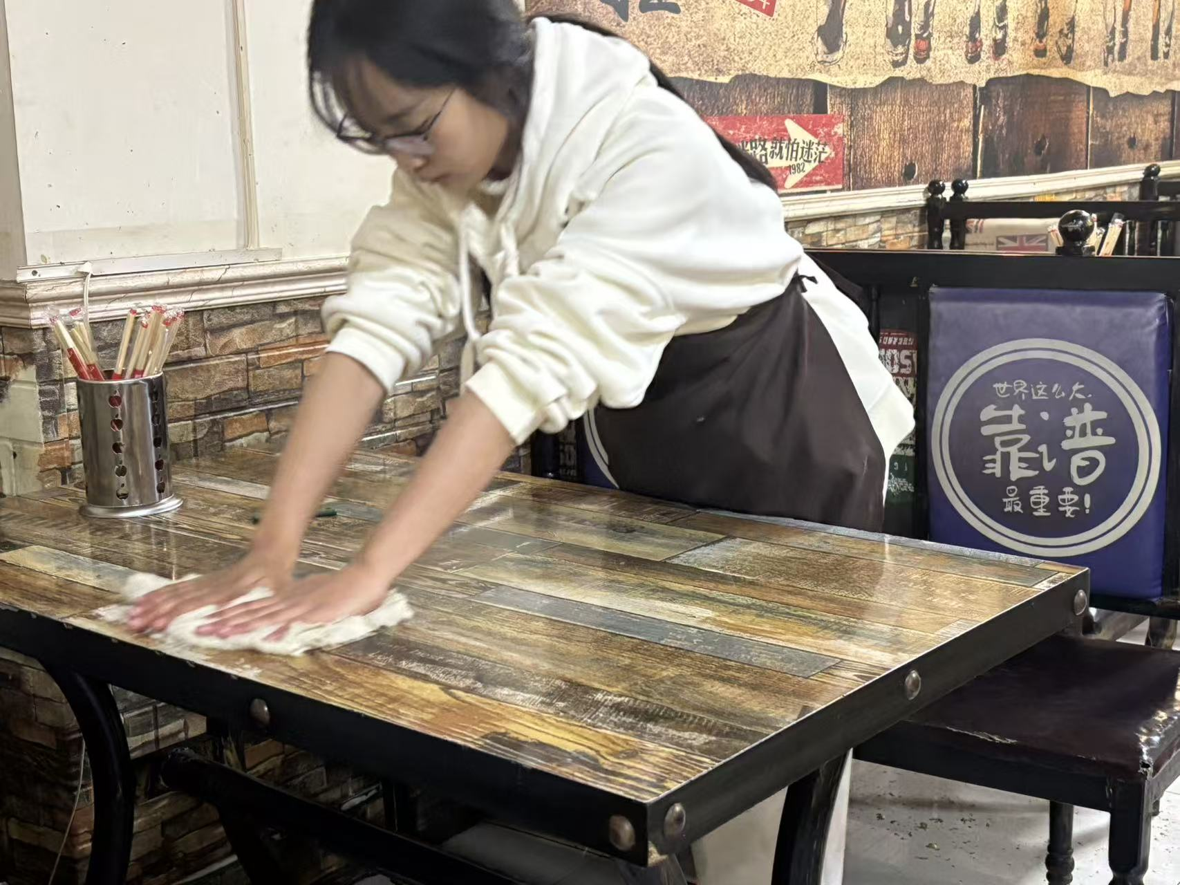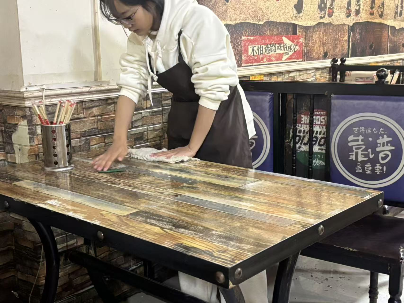 这份工作十分忙碌,每日十点到岗先完成卫生、消毒、餐具摆放等细致的准备工作,午晚市需全程做好引导、点餐、传菜、席间服务等工作,收工后还要收尾整理,常常忙到深夜,身体倍感疲惫。