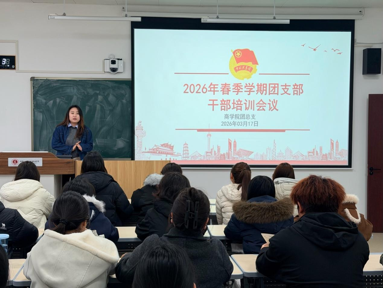 在团支部工作介绍环节,贺苗苗重点围绕本学期团务工作展开培训。她首先强调了团支部在支部建设中的核心作用,随后,讲解了寒假社会实践成果的规范提交要求,并说明了本学期“优化团课形式”的具体标准:要求每次团课不少于1学时、团支书要做好图文记录与总结反思、并及时录入智慧团建系统等要求。