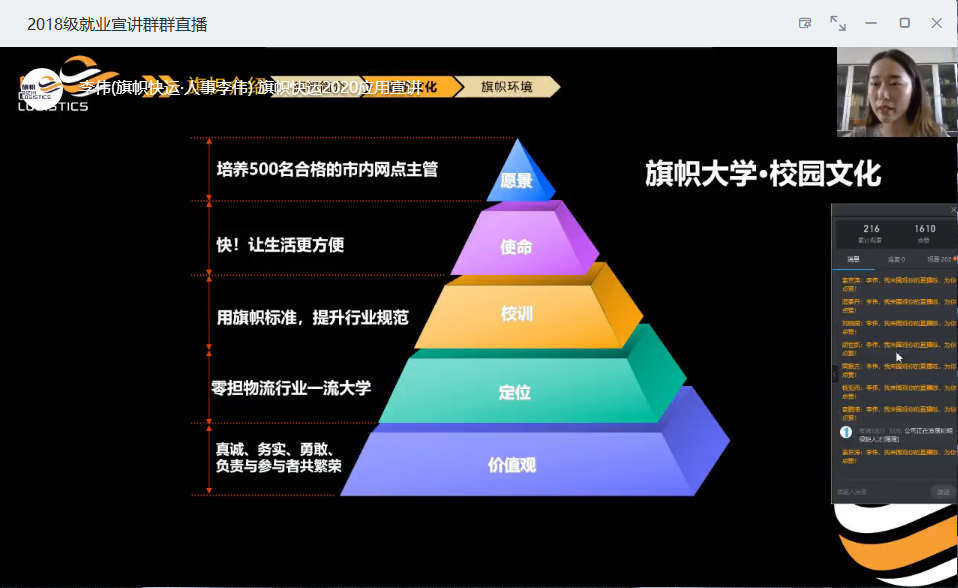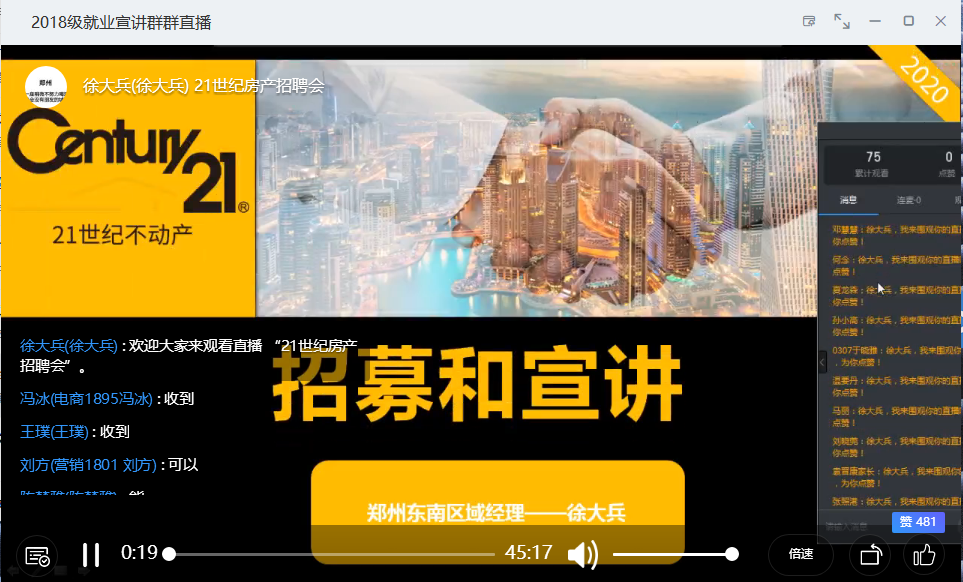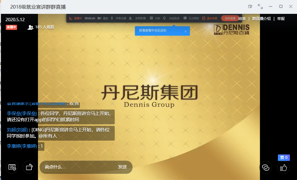 自线上云招聘开启以来,同学们反响热烈,积极参与。皇冠APP体育多措并举,持续发力,于2020年5月12日下午举行了3场联播云招聘活动。本次招聘由丹尼斯总部人力开发处经理欧阳贞妮、河南旗帜物流有限公司人事经理李伟和21世纪郑州东南片区经理徐大兵为2018级员工做就业宣讲,皇冠APP体育2018级400余名员工通过钉钉直播参与宣讲会。