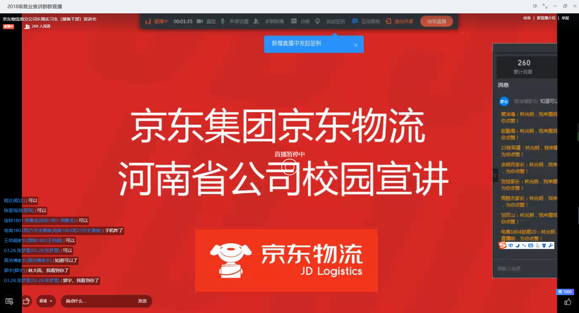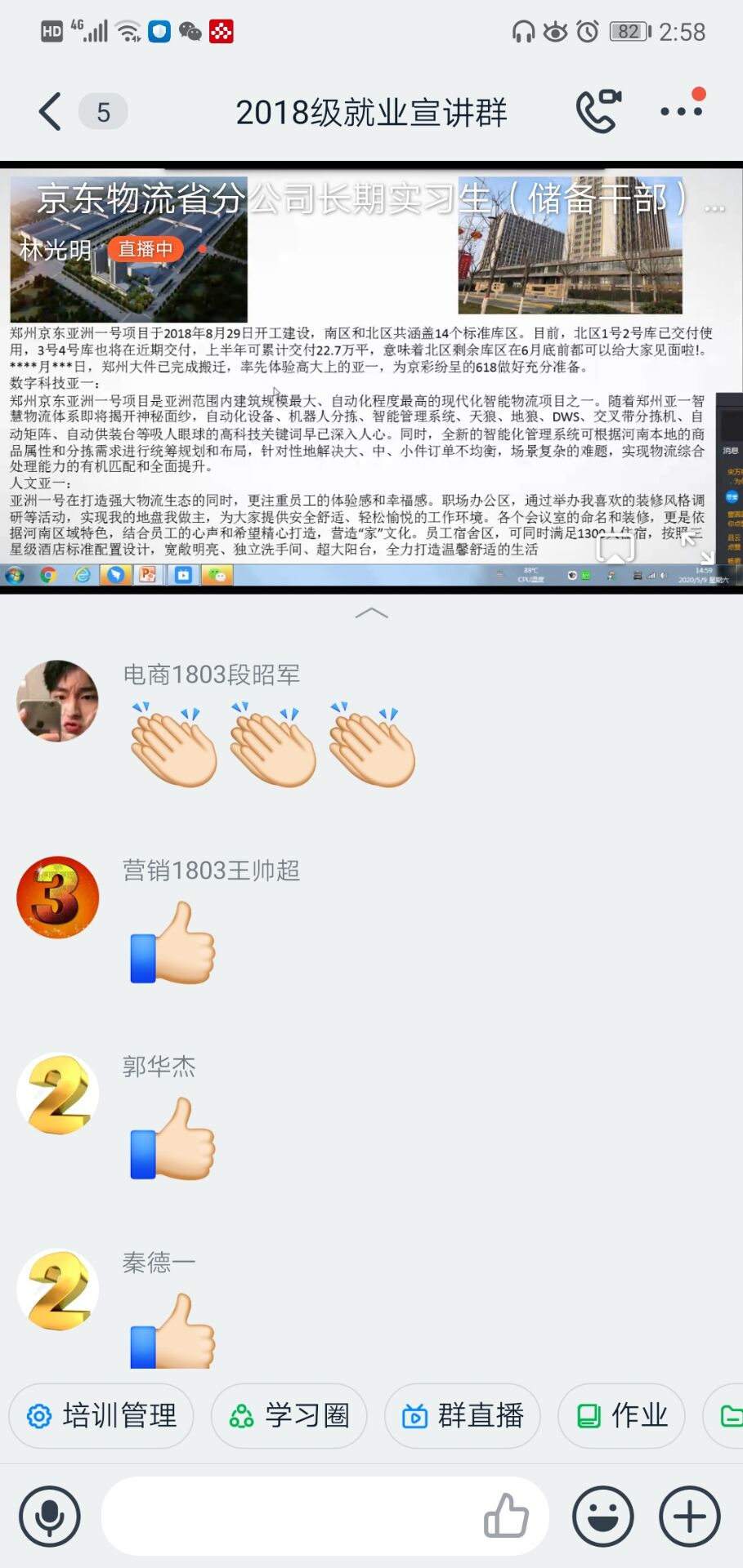 林经理在钉钉直播中介绍了京东目前的情况、企业文化、招聘要求、薪资标准及发展前景等等,为物流管理和电子商务专业员工提供了对口就业的机会,同学们认真聆听并积极参与互动。宣讲会后,京东“云招聘”工作启动,同学将通过线上投递简历应聘相应岗位,皇冠APP体育辅导员老师会全程参与招聘,致力为各位同学提供最好就业服务,全程助力2020年就业工作。