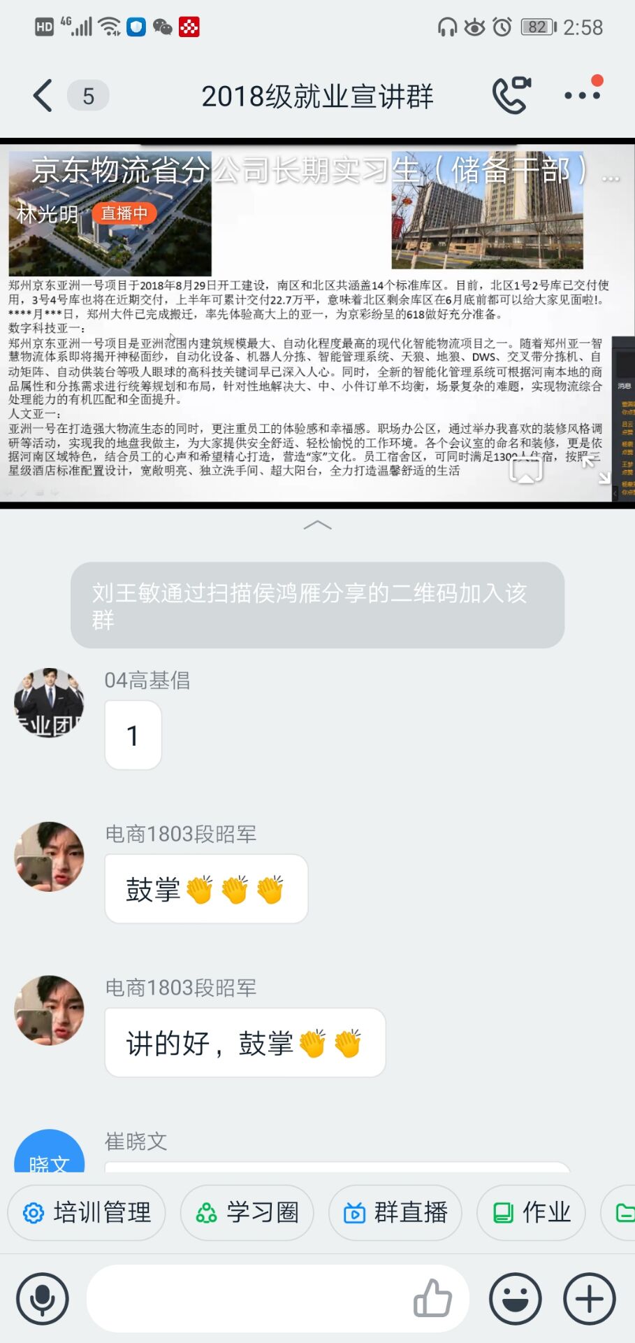 为积极应对新冠肺炎疫情带来的挑战,为广大毕业生搭建更好的就业平台,助力2018级员工预就业,皇冠APP体育推出了“云招聘”线上求职活动。2020年5月9日14:00,京东物流河南省公司人力资源部林经理利用钉钉直播为2018级员工做了校园宣讲,皇冠APP体育2018级400余名员工参与宣讲会。
