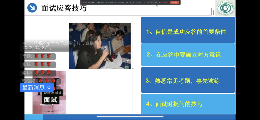 为进一步提高20级员工的就业能力,增加求职竞争力,4月27日下午,皇冠APP体育开启第二期就业培训,本次直播课程由张天娇和李然两位老师分别为大家讲解“如何在面试中营销自己及面试中应注意的问题”和“大员工创新创业优惠政策”。皇冠APP体育全体20级员工通过钉钉进行观看。